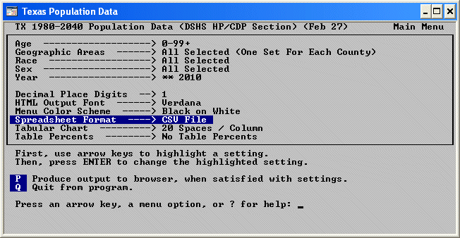Saving to a second format - The output in your desktop browser always includes (at the bottom of the output) links to ASCII text (txt), spreadsheet (csv, tsv, or dif), and dBASE III (dbf) output. To view or download one of the second formats, simply click on the appropriate link, such as "dBASE III".